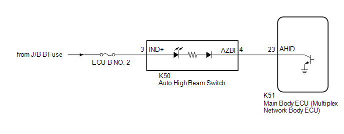 When the automatic high beam system is on, the main body ECU (multiplex network body ECU) illuminates the auto high beam switch indicator.