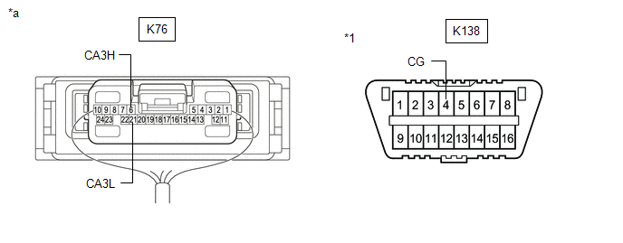 There is no resistance between terminal 6 (CA3H) of the central gateway ECU (network gateway ECU) and terminal 4 (CG) of the DLC3, or terminal 21 (CA3L) of the central gateway ECU (network gateway ECU) and terminal 4 (CG) of the DLC3. |