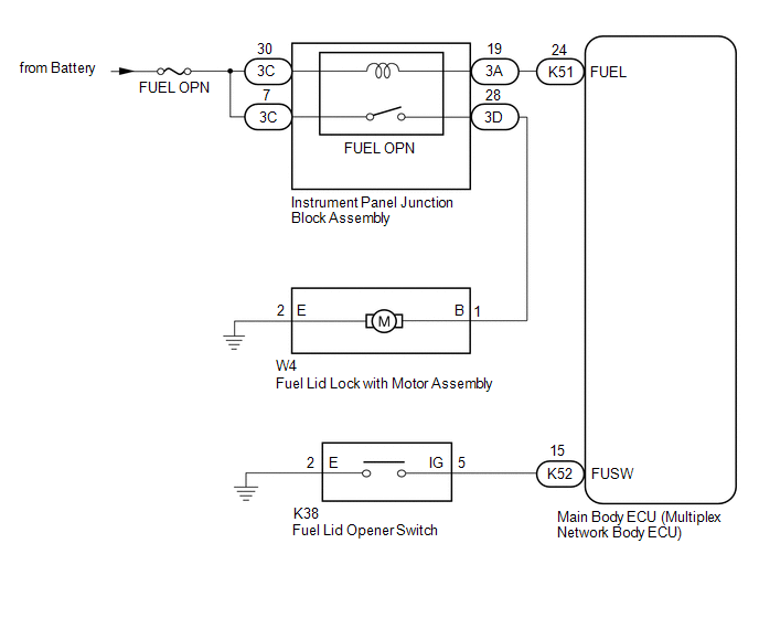 When the fuel lid opener switch is pushed for 0.8 second, the main body ECU (multiplex network ECU) turns on the FUEL OPN relay, and the fuel lid lock with motor assembly opens the fuel lid.