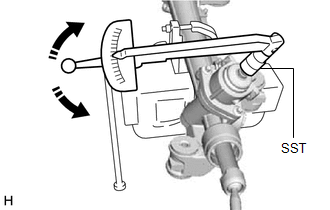 (b) Using SST and a torque wrench, turn the pinion shaft continuously at a rate of 4 to 6 seconds per turn to inspect the total preload of the rack and pinion power steering gear assembly.