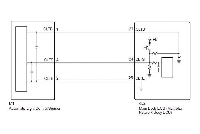 The automatic light control sensor detects ambient light. The sensor creates an electrical signal based on the amount of light detected, and sends the signal to the main body ECU (multiplex network body ECU). The main body ECU (multiplex network body ECU) turns on or off the headlights and taillights according to the signal.