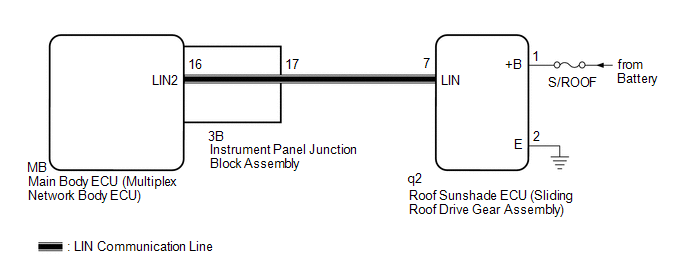 This DTC is stored when LIN communication between the roof sunshade ECU (sliding roof drive gear assembly) and main body ECU (multiplex network body ECU) stops for 10 seconds or more.