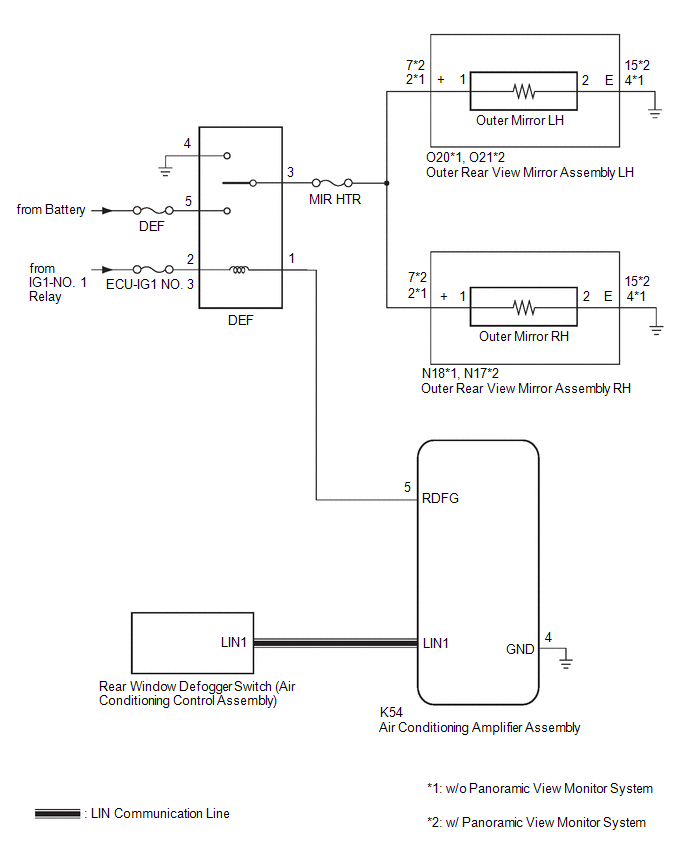 When the mirror heater switch (rear window defogger switch) on the air conditioning control assembly is pressed, the operation signal is sent to the air conditioning amplifier assembly via LIN communication. When the air conditioning amplifier assembly receives the signal, it turns on the DEF relay to operate the mirror heaters.