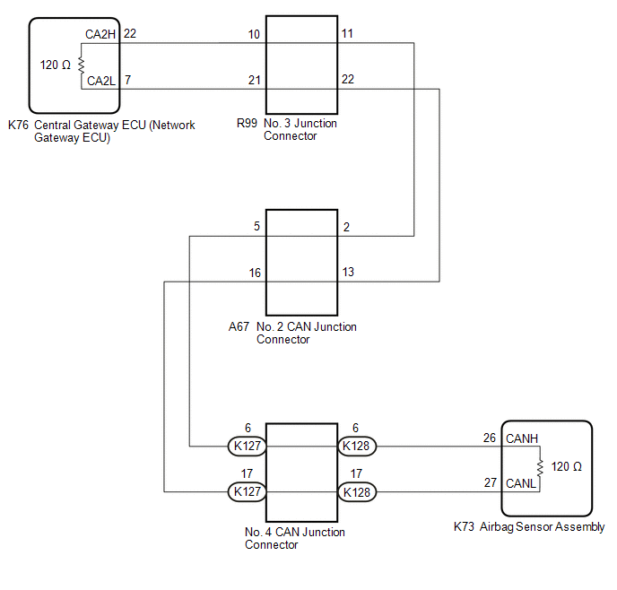 Resistance between terminals 22 (CA2H) and 7 (CA2L) of the central gateway ECU (network gateway ECU) is 70 Ω or higher. |