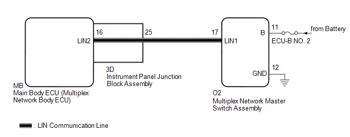 This inspection is to check the LIN communication line in the instrument panel junction block assembly that connects the wire harness to the built-in main body ECU (multiplex network body ECU).