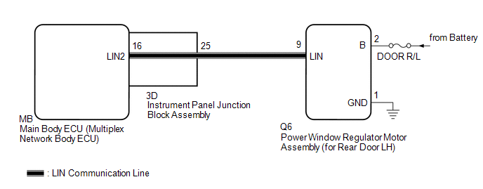 This DTC is stored when LIN communication between the power window regulator motor assembly (for rear door LH) and main body ECU (multiplex network body ECU) stops for 10 seconds or more.