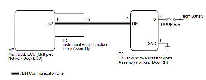 This DTC is stored when LIN communication between the power window regulator motor assembly (for rear door RH) and main body ECU (multiplex network body ECU) stops for 10 seconds or more.
