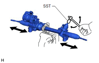 | (a) Using SST, rotate the pinion shaft to see if both the left and the right steering rack boots expand and contract smoothly. SST: 09616-00011 HINT: If the left and right steering rack boots do not expand and contract smoothly, use new No. 2 steering rack boot clamps and reinstall the steering rack boots. |