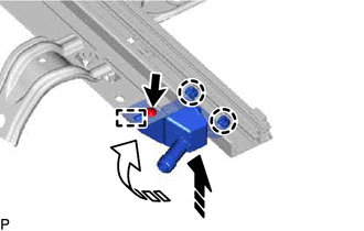 (d) Move the sliding roof piece sub-assembly LH in the direction indicated by the arrow (2) shown in the illustration to engage the guide.