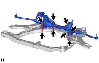 | (a) Remove the 4 bolts, 4 nuts and rack and pinion power steering gear assembly from the front frame assembly. NOTICE: Because the nut has its own stopper, do not turn the nut. Loosen the bolt with the nut secured. |