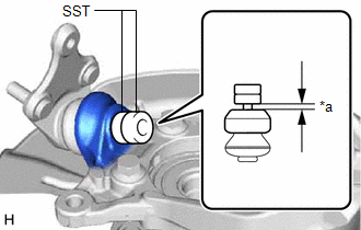 | (d) Install SST to the front lower ball joint assembly as shown in the illustration. SST: 09960-20010 09961-02050 NOTICE: Check that the clearance measurement between SST and the front axle assembly is 1 mm (0.0394 in.). |