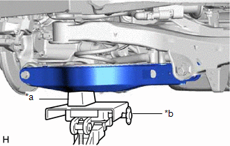 | (a) Using a transmission jack and a wooden block, support the rear No. 2 suspension arm assembly. NOTICE: