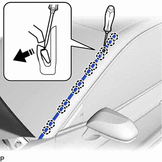 | (d) Lightly press the drill bit against the No. 3 windshield outside moulding clips to drill off the No. 3 windshield outside moulding clip flanges, and remove the 6 No. 3 windshield outside moulding clips. CAUTION: Be careful of the drilled No. 3 windshield outside moulding clips, as they may be hot. NOTICE: