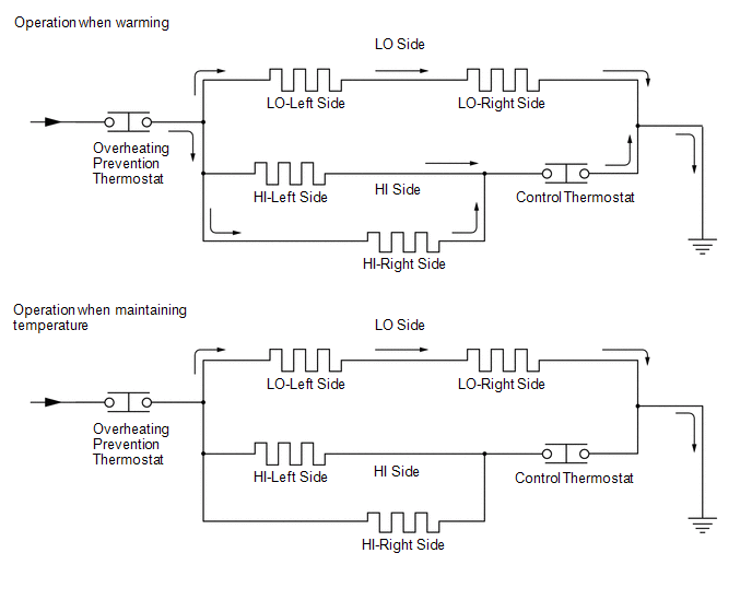 (c) While operating to maintain the temperature of the steering wheel, if the temperature drops to the operation temperature of the control thermostat, the control thermostat restarts the flow of current to both the LO and HI sides to warm the steering wheel.