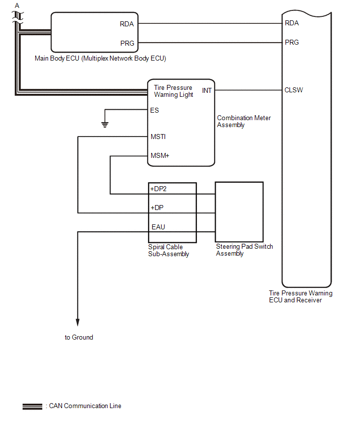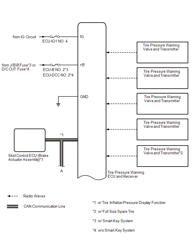 Each tire pressure warning valve and transmitter sends its transmitter ID, temperature and tire pressure information to the tire pressure warning ECU and receiver.
