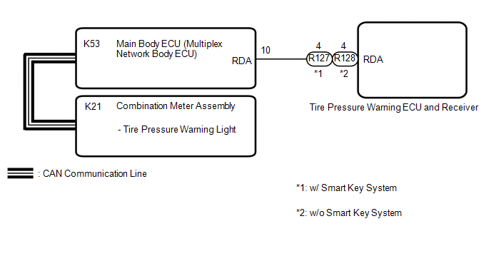 The tire pressure warning ECU and receiver sends the tire pressure warning light illumination request signal to the main body ECU (multiplex network body ECU) via a direct line. The main body ECU (multiplex network body ECU) then sends the signal to the combination meter assembly via CAN communication.